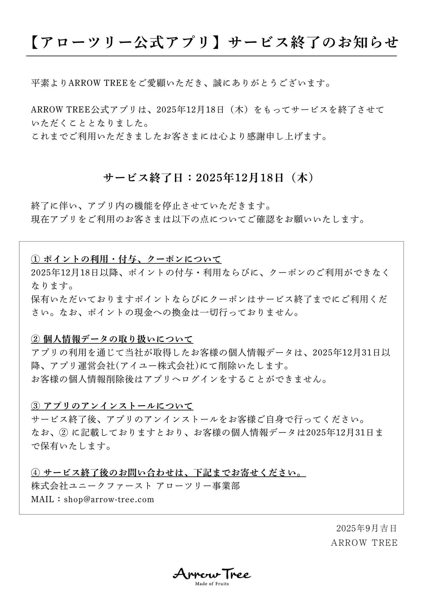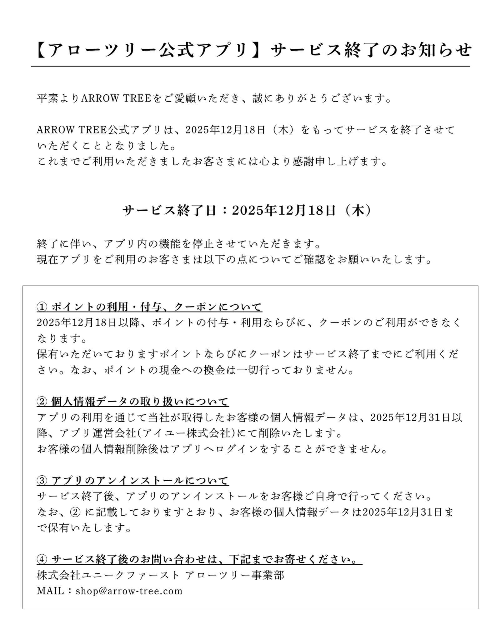 【重要】アローツリー公式アプリ サービス終了のお知らせ