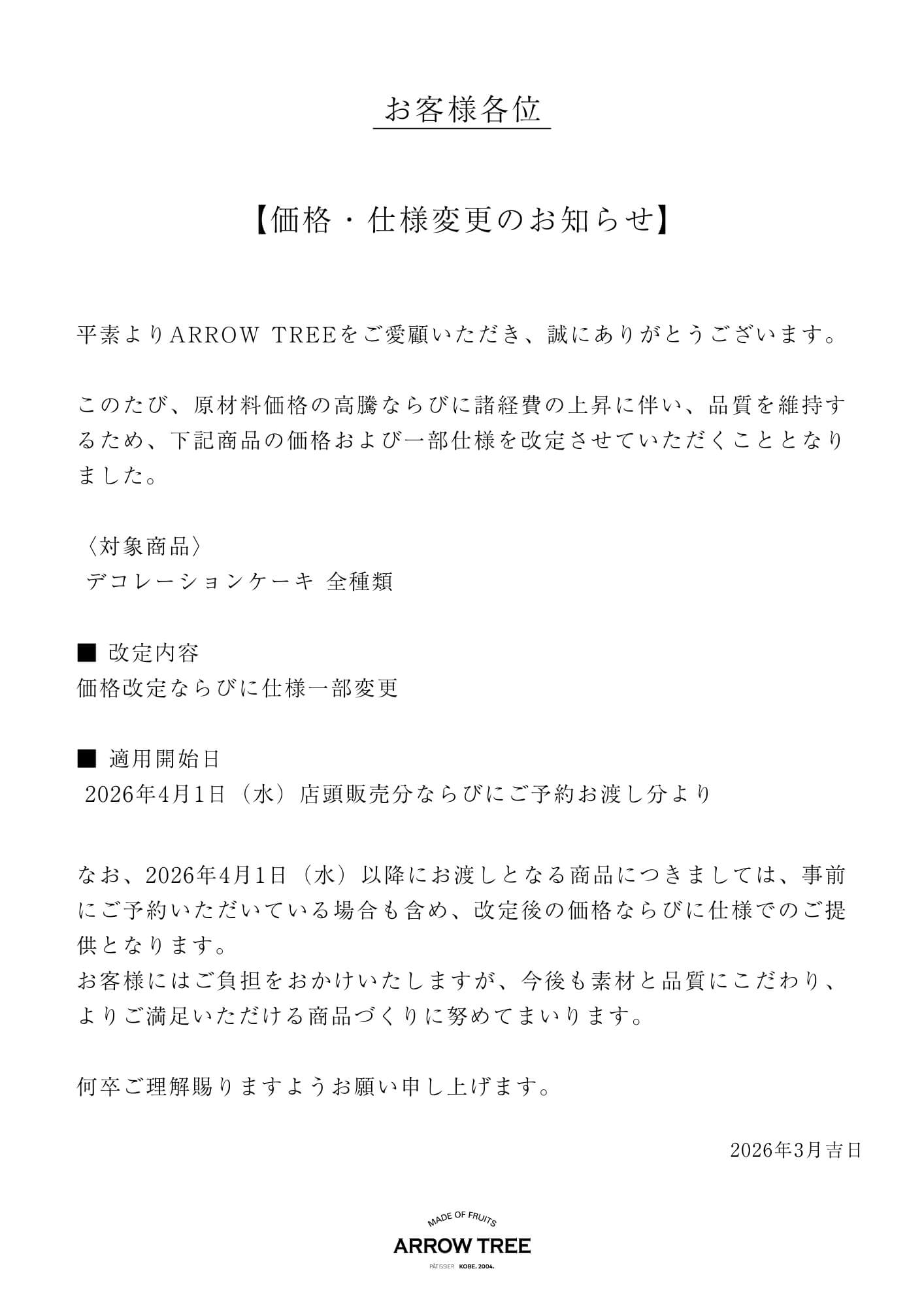 【お知らせ】デコレーションケーキ価格改定・仕様変更のお知らせ