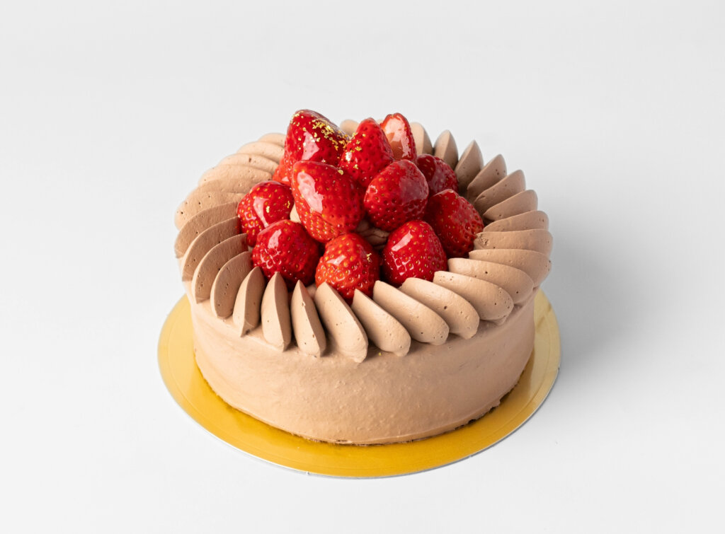 カカオの豊かな風味を閉じ込めたスポンジに、ガーナ産カカオを使用したビターなガナッシュクリームを重ね、甘酸っぱい苺を贅沢にあしらいました。