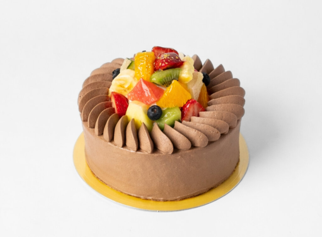 カカオの豊かな風味を閉じ込めたスポンジに、ガーナ産カカオを使用したビターなガナッシュクリームを重ね、彩り豊かなフルーツを贅沢にあしらいました。