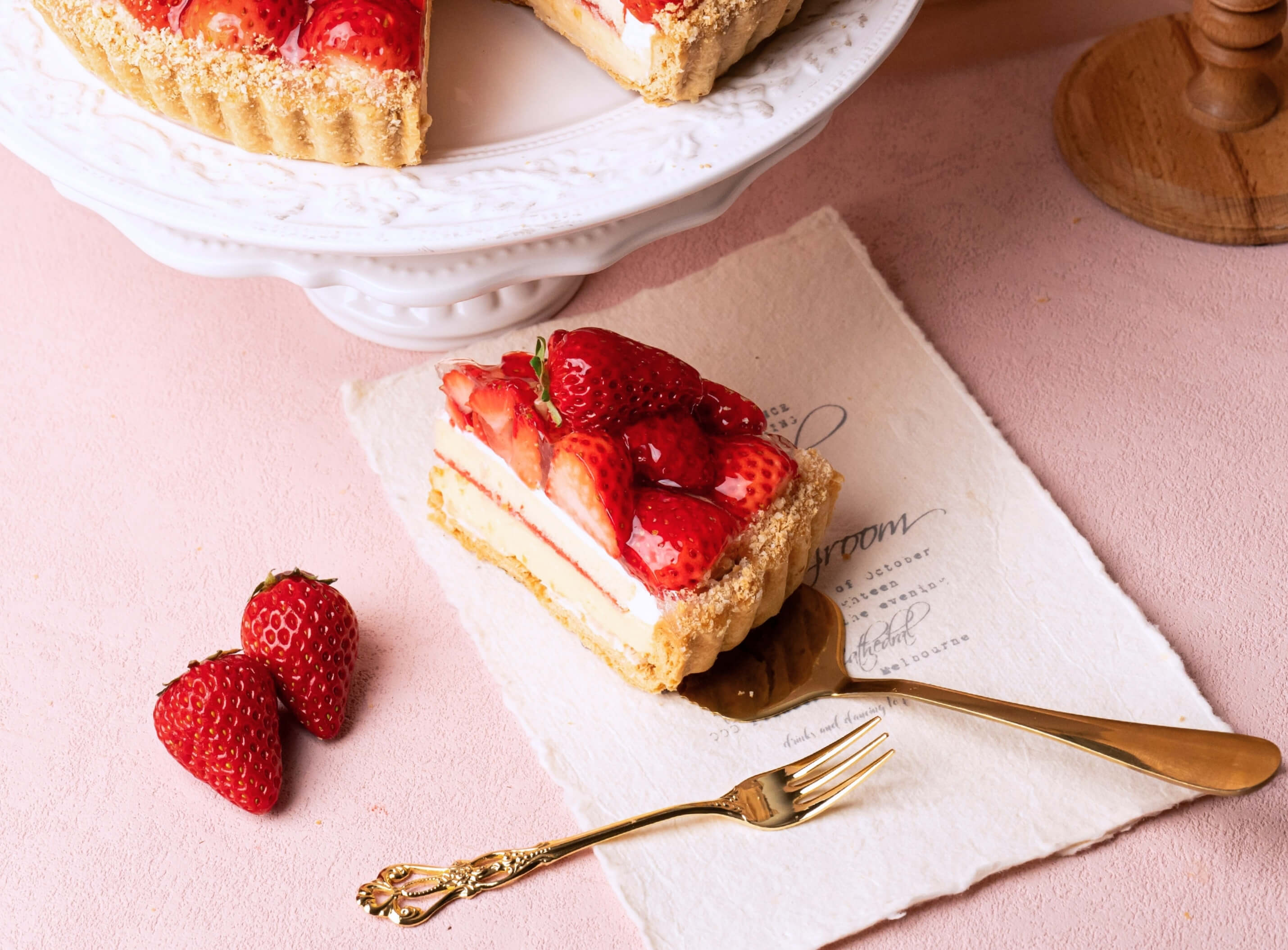 香ばしいアーモンドタルトに、なめらかな苺クリームを重ねました。